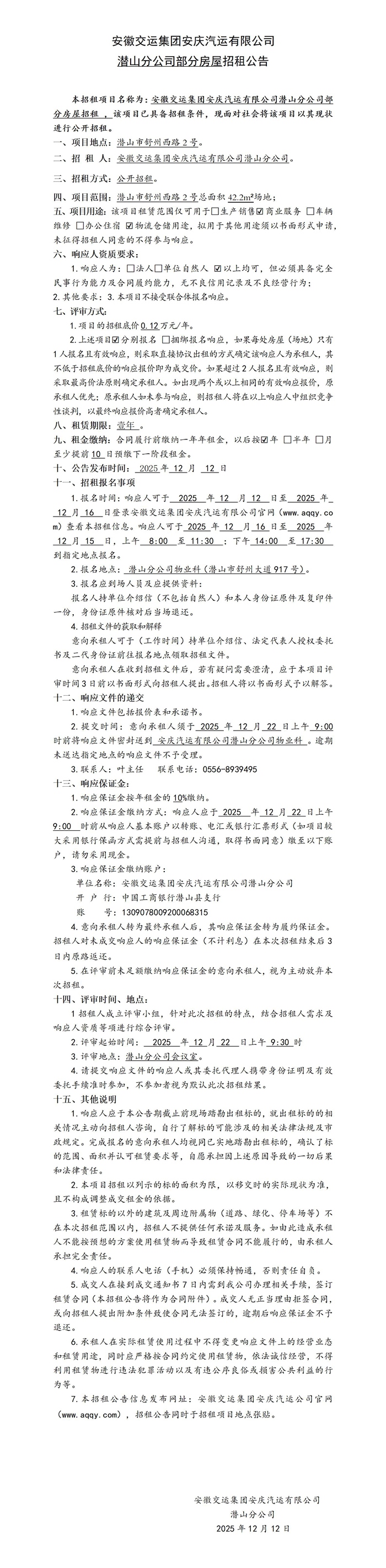 潛山分公司部分房屋招租公告