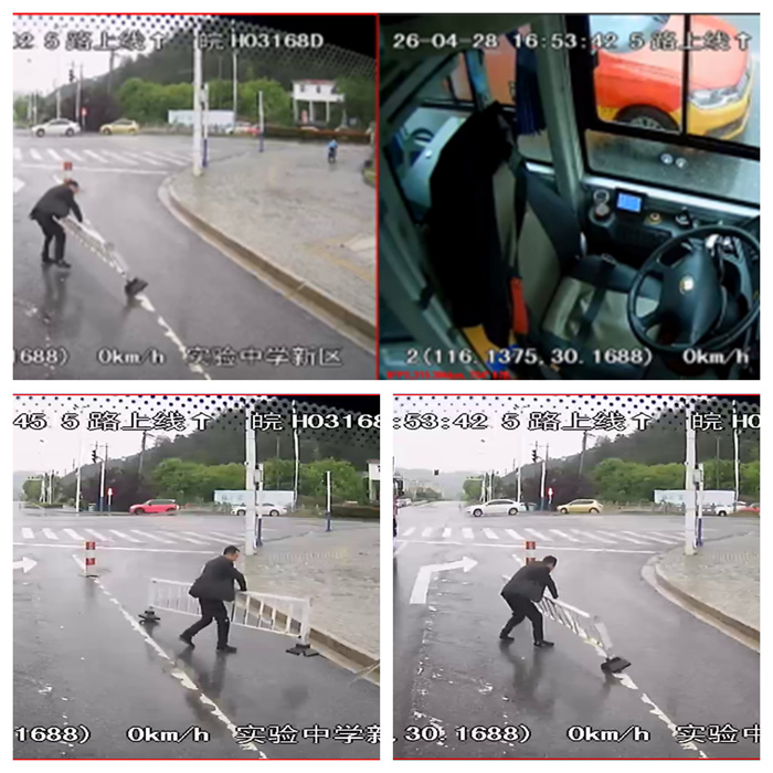 就在此時,宿松城市公交分公司5路公交車駕駛員劉師傅駕駛著皖H03168D公交車途經(jīng)此地。他敏銳地察覺到路面倒伏護欄造成的潛在危險,立即采取應(yīng)急措施。劉師傅穩(wěn)穩(wěn)把控方向盤,將公交車安全?吭诼愤,并迅速打開車輛雙閃警示燈,提醒后方來車注意避讓。在確認車上乘客安全無虞后,他毅然決然地冒著傾盆大雨、頂著陣陣強風下車處置險情。